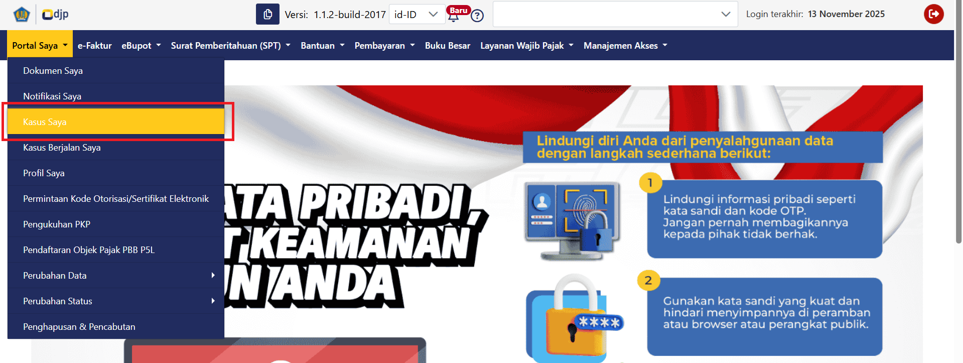 - Setelah catat atau unduh SPKKP, lanjutkan dengan kembali laman awal menu Coretax DJP, klik Portal Saya dan pilih Kasus Saya.