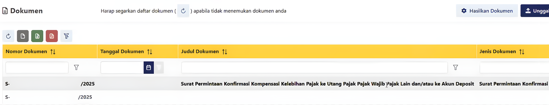 - Refresh dan klik filter kolom Judul Dokumen dengan mengisi Surat Permintaan Konfirmasi Kelebihan Pajak. Silakan catat nomor dan tanggal SPKKP. Wajib pajak juga dapat unduh SPKKP dengan gulir ke kanan lalu klik Unduh.