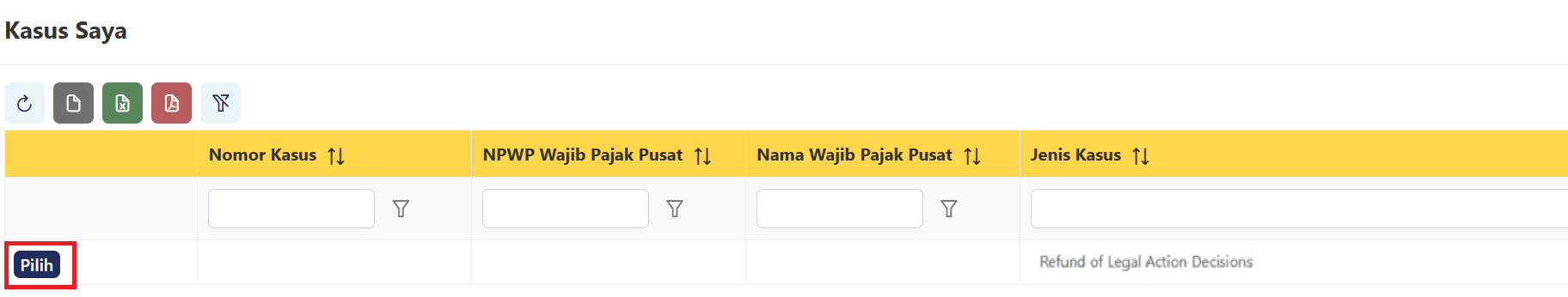 - Klik tombol Refresh, cari Refund of Legal Actions Decisions dengan tanggal yang sama dengan SPKKP, kemudian klik tombol Pilih.