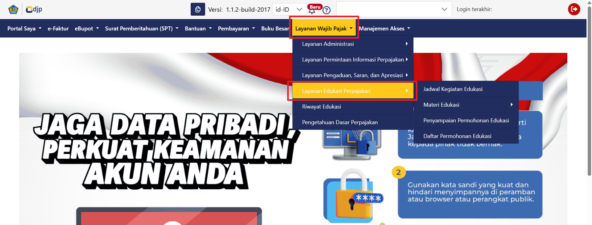 - Akses menu Layanan Wajib Pajak→Layanan Edukasi Perpajakan. Pada Layanan Edukasi Perpajakan, terdapat 4 submenu yang dapat dipilih berdasarkan kebutuhan, antara lain: