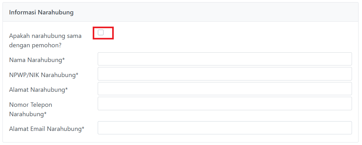 - Lanjut dengan lengkapi Informasi Narahubung. Dalam hal narahubung sama dengan pemohon Anda dapat mencentang pilihan tersebut. Jika narahubung berbeda dengan nama pemohon, isikan nama, NPWP, alamat, nomor dan surel narahubung.
