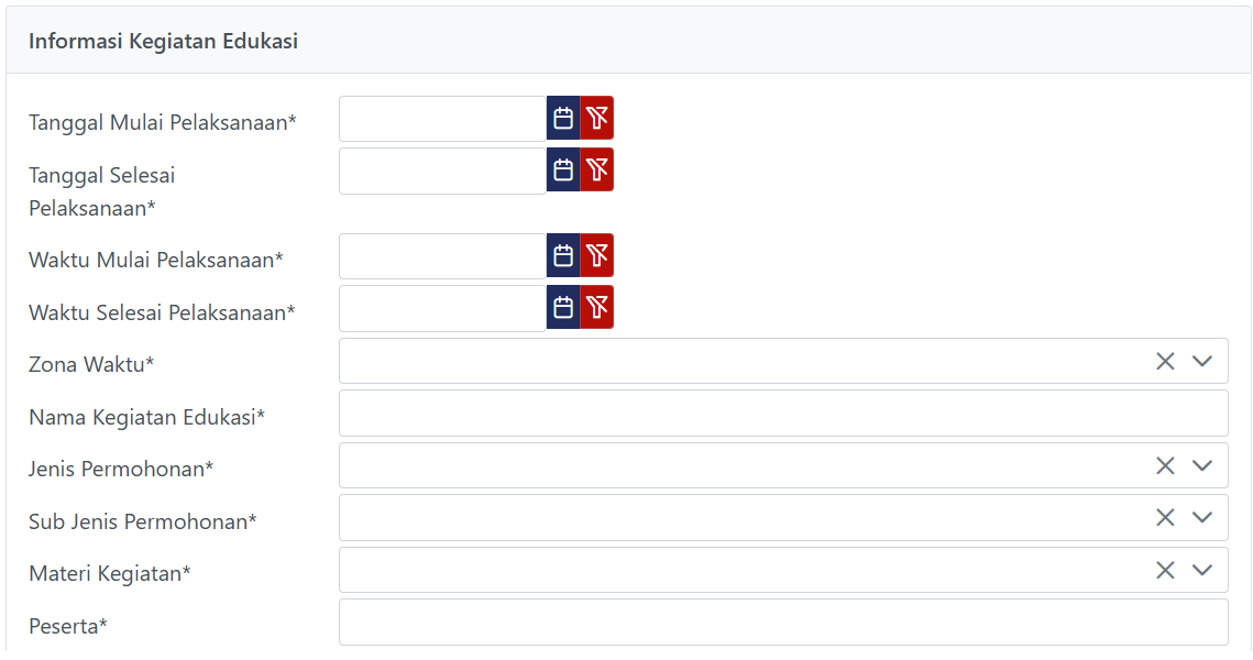 - Lengkapi Informasi Kegiatan Edukasi dengan mengisi Tanggal Pelaksanaan, Waktu Pelaksanaan, Nama Kegiatan Edukasi, Jenis Permohonan, Materi Kegiatan, Peserta, dan Lokasi Kegiatan.