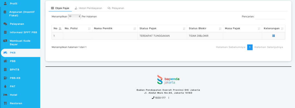 - Pilih Menu PKB. Seluruh nomor polisi kendaraan bermotor yang terdaftar atas NIK akan muncul pada Objek Pajak.