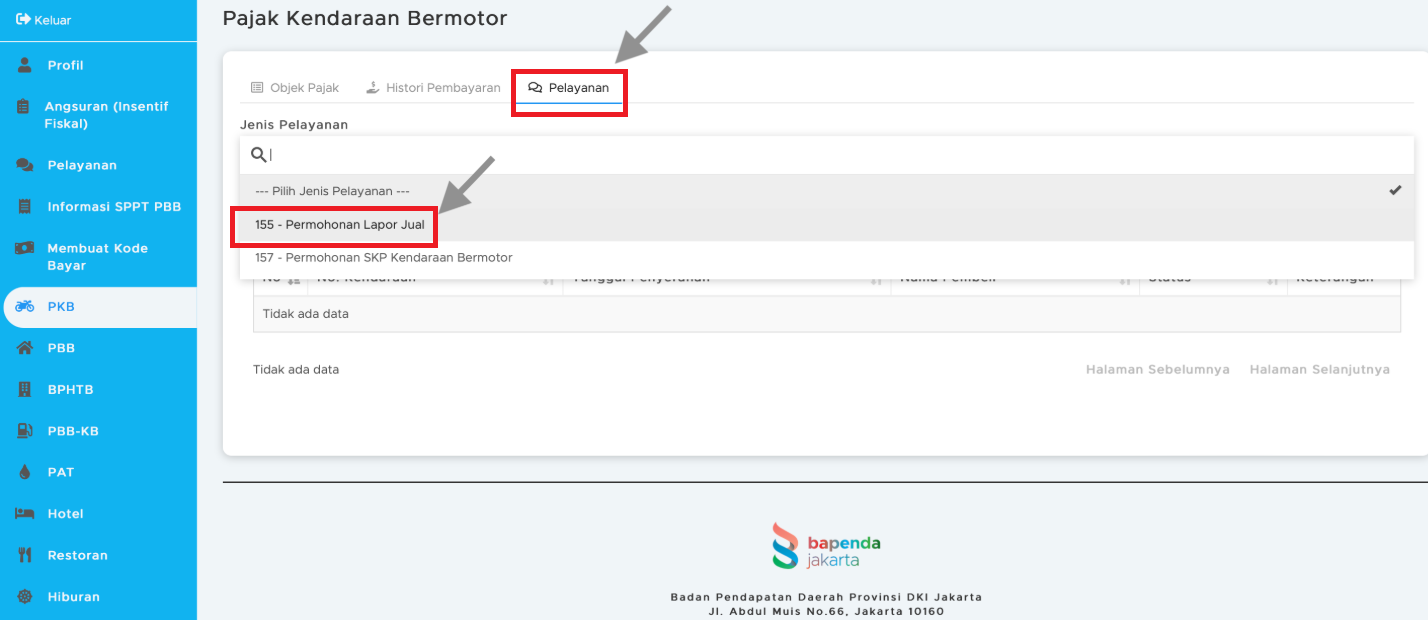 - Pilih Pelayanan, dan pilih Jenis Pelayanan Permohonan Lapor Jual.