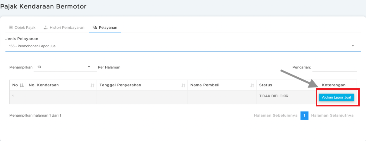 - Klik Ajukan Lapor Jual untuk nomor polisi kendaraan yang dikehendaki.