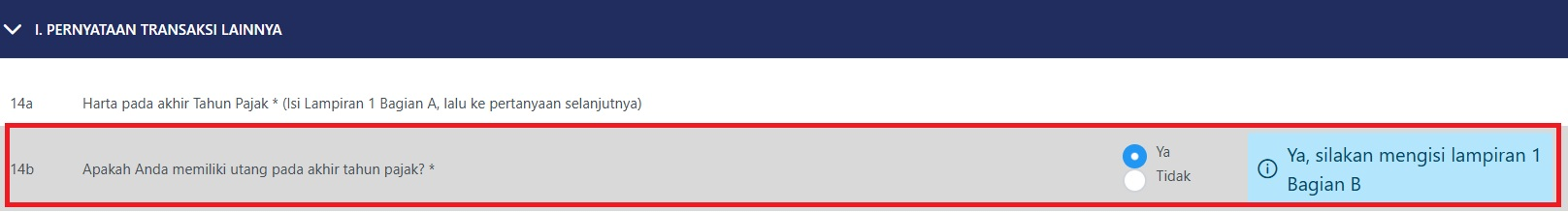 Untuk dapat melakukan penambahan data utang pada L1 Bagian B, maka wajib pajak harus terlebih dahulu mengisi pertanyaan nomor 14b pada formulir Induk dengan "Ya".