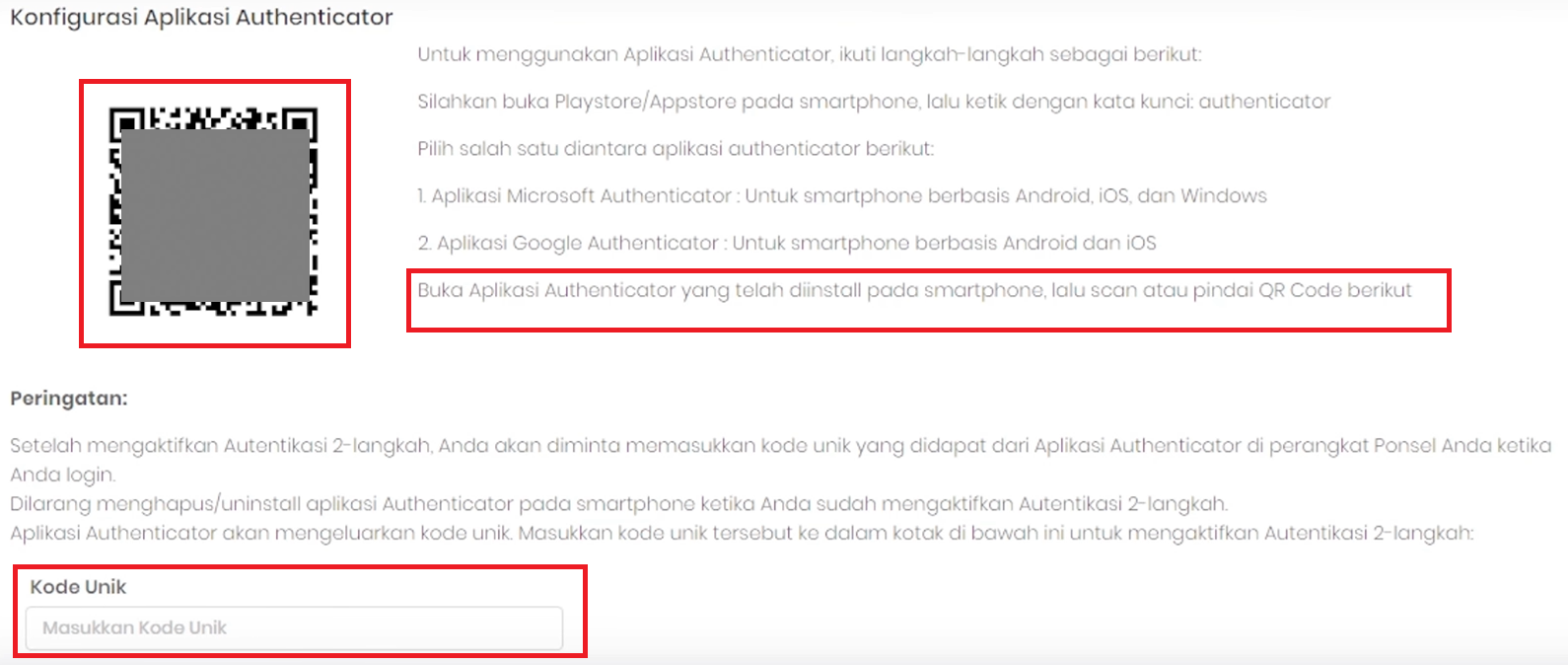 - Akan tampil petunjuk melakukan Konfigurasi Aplikasi Authenticator. Pada langkah ini, Anda dapat memindai QR Code yang muncul di layar desktop, kemudian aplikasi secara otomatis akan memberikan 6 digit kode unik pada Google Authenticator. Masukkan 6 digit kode unik tersebut pada halaman otentikasi dua langkah dan klik Aktifkan Autentikasi Dua Langkah.