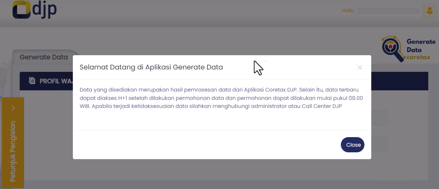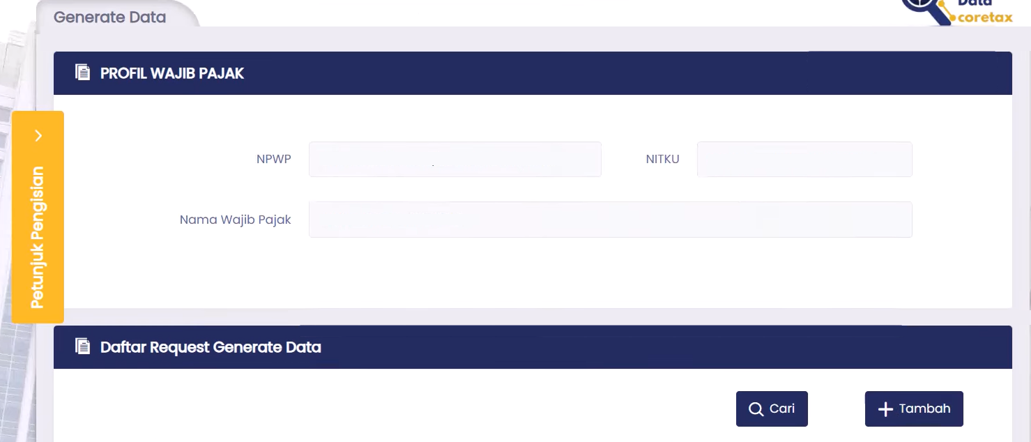 - Pada laman awal aplikasi GENTA, akan tampil Profil Wajib Pajak dan Daftar Request Generate Data.