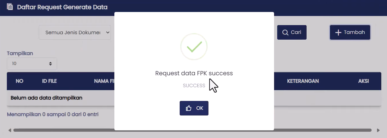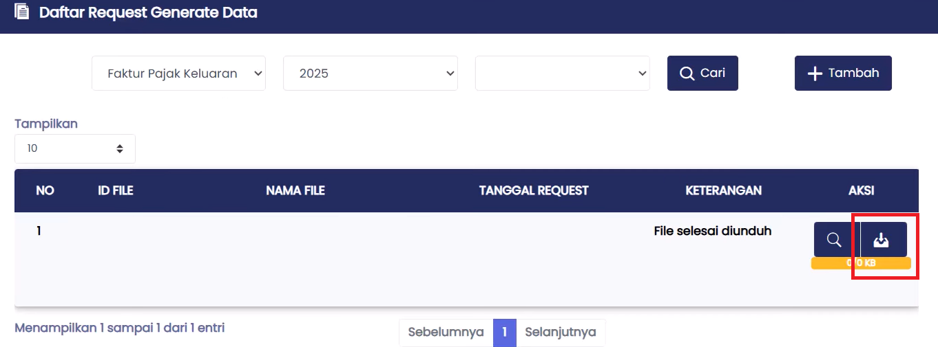 - Dalam hal keterangan pada Daftar Request Generate Data berubah menjadi File Selesai Diunduh, klik action Download.