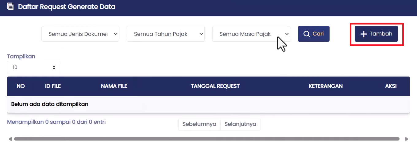 - Untuk mengajukan permohonan data perpajakan pada Coretax, klik Tambah. Pada bagian ini, Anda harus mengisi permohonan dengan memilih jenis dokumen, tahun pajak, dan masa pajak yang ingin diunduh melalui GENTA.