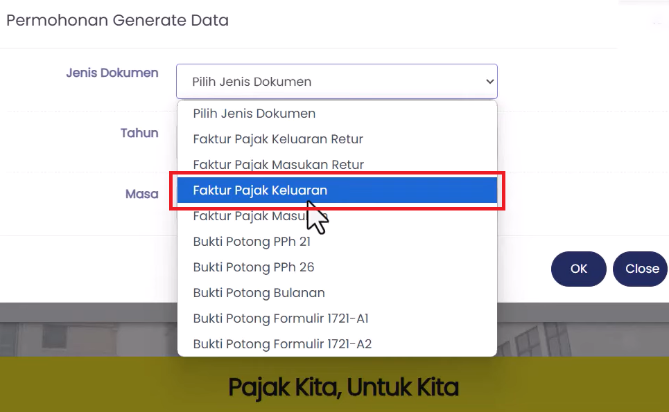 - Pada kasus ini, jenis dokumen yang diajukan untuk diunduh secara massal adalah Faktur Pajak Keluaran. Klik OK.