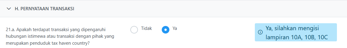 Apabila wajib pajak menjawab Ya, terdapat 3 lampiran yang secara otomatis akan muncul. Yaitu, lampiran 10 A,10 B dan 10 C. Lampiran 10 A dan 10 B berkaitan dengan transaksi yang dipengaruhi hubungan istimewa, sementara Lampiran 10 C untuk transaksi dengan pihak yang merupakan penduduk tax haven country. Definisi tax heaven country yang dimaksud pada Lampiran 10 C diatur dalam Peraturan Direktur Jenderal Pajak Nomor PER-11/PJ/2025 (PER 11/2025).