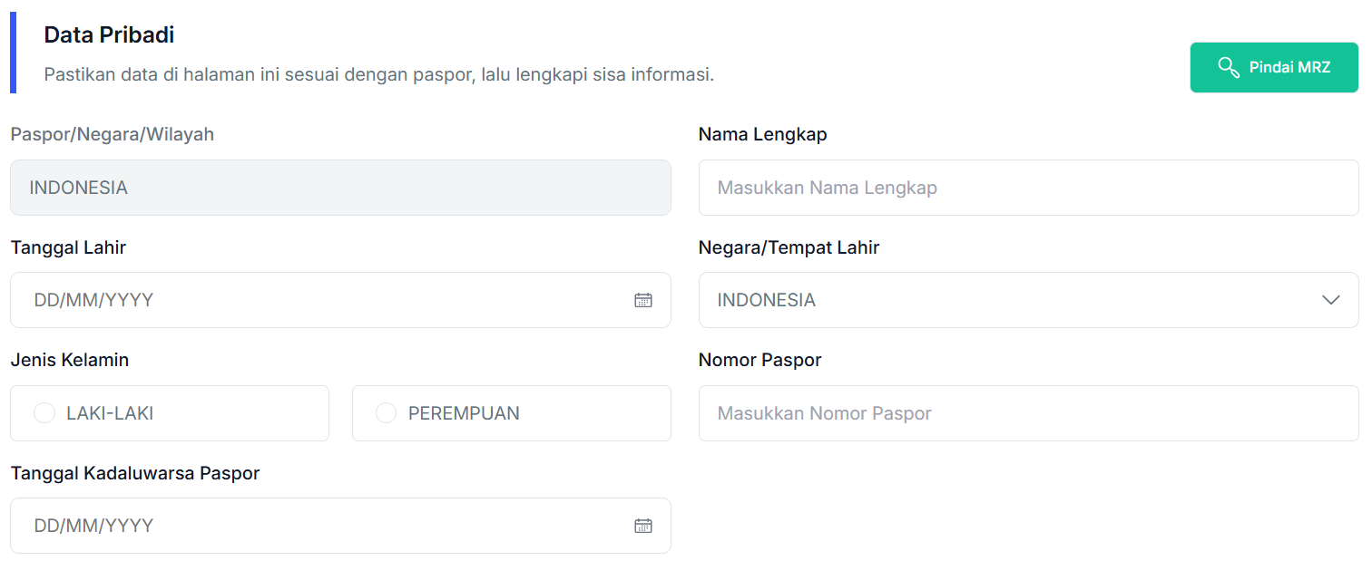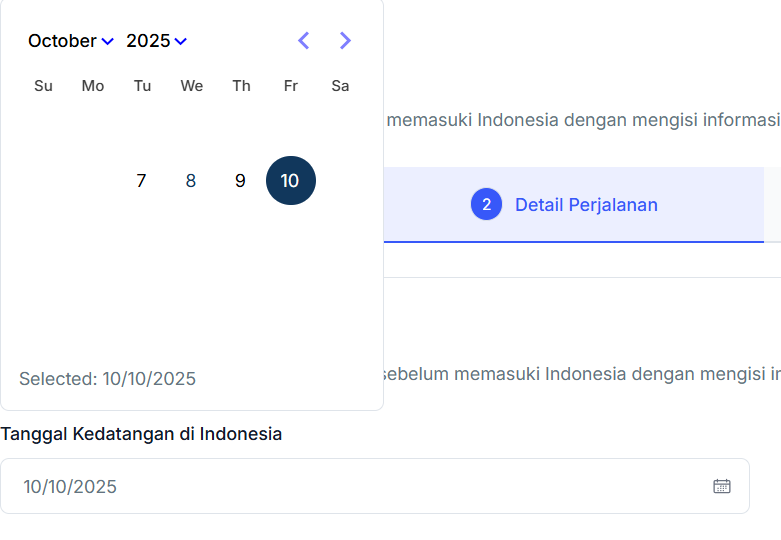 - Sebagai informasi, detail tanggal kedatangan dapat diisi H-2 pada saat kedatangan dan/atau H+1 pada saat kedatangan di Indonesia. Sebagai contoh, tanggal kedatangan Anda di Indonesia yaitu 10 Oktober 2025, Anda dapat mengisi formulir aplikasi ini pada tanggal 8 Oktober 2025 (H-2 waktu kedatangan). Lebih lanjut, jika kedatangan Anda di Indonesia adalah 7 Oktober 2025, Anda juga dapat mengisi formulir kedatangan tersebut pada 8 Oktober 2025 (H+1 waktu kedatangan).