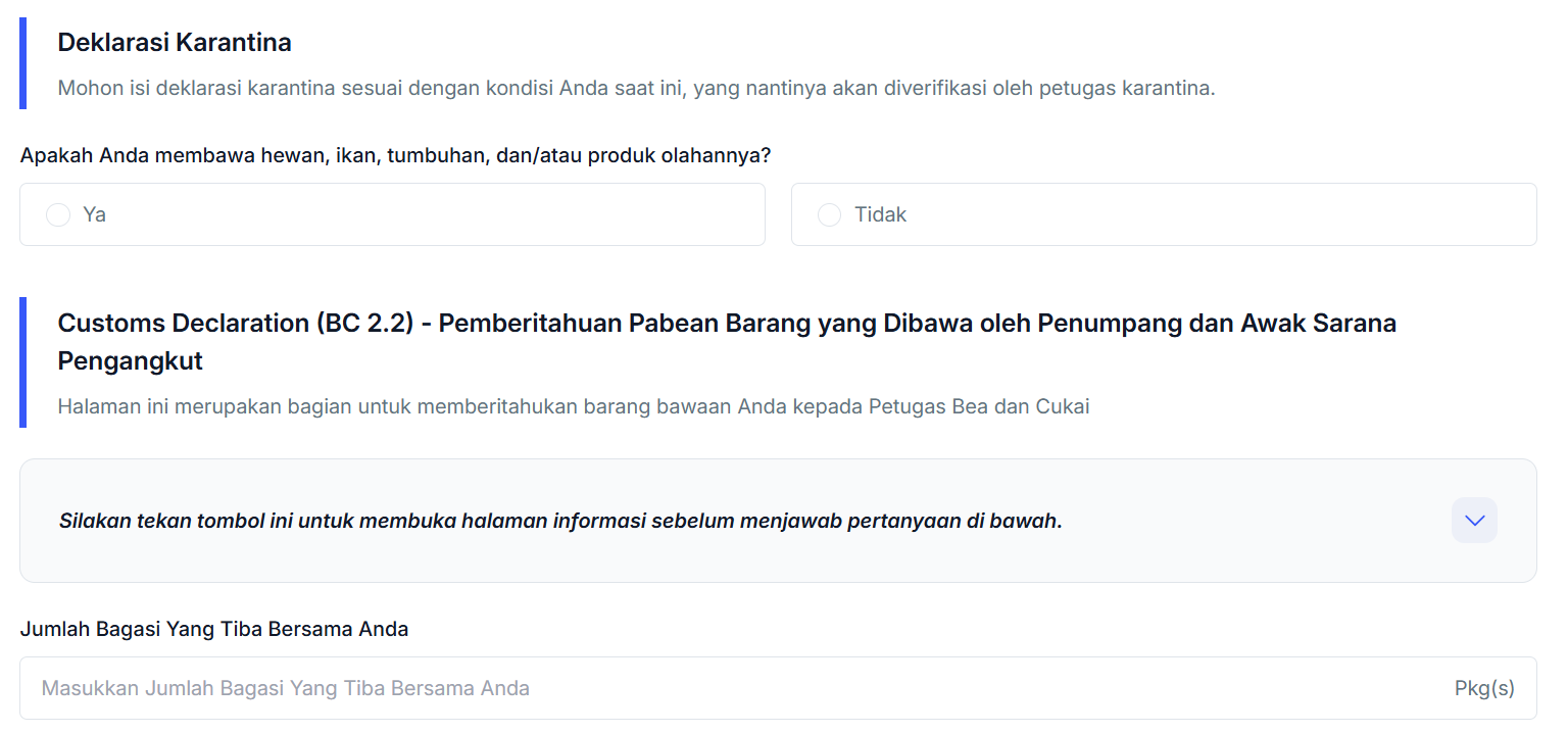 - Setelah mengisi informasi deklarasi kesehatan sebelum memasuki wilayah Indonesia, Anda juga perlu memberi informasi terkait pernyataan barang impor yang dibawa oleh penumpang atau barang serta produk yang memungkinkan termasuk ke dalam kategori karantina.