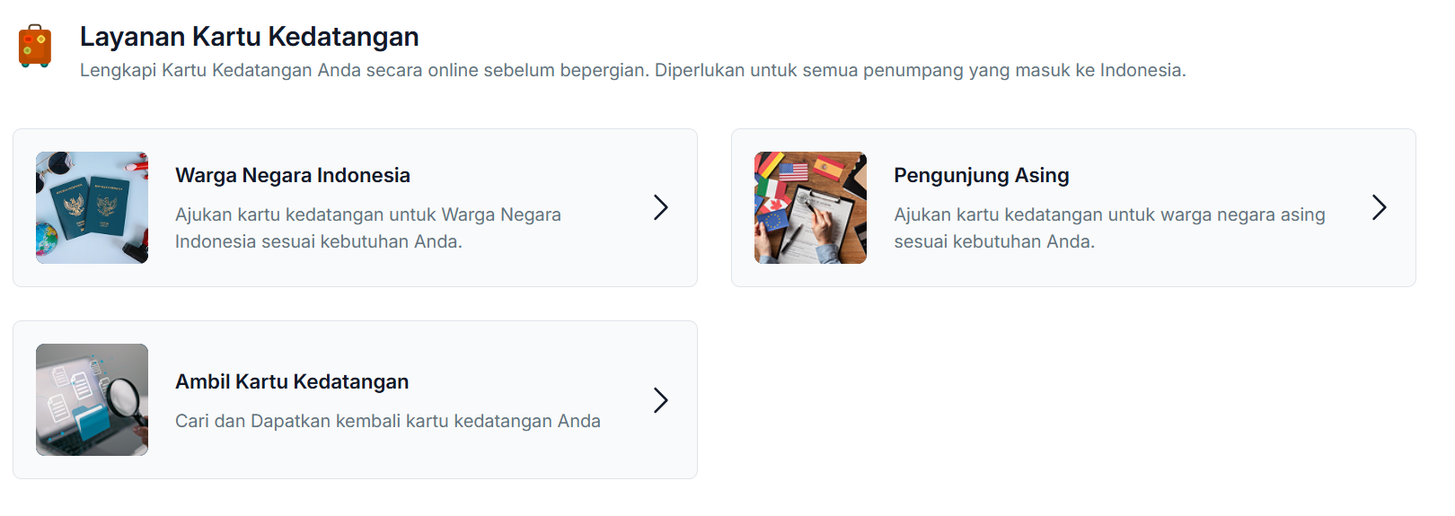 - Dalam layanan kartu kedatangan Warga Negara Indonesia, Anda diminta mengisi sejumlah informasi pribadi meliputi data pribadi pelaku perjalanan utama dan informasi kontak pribadi.