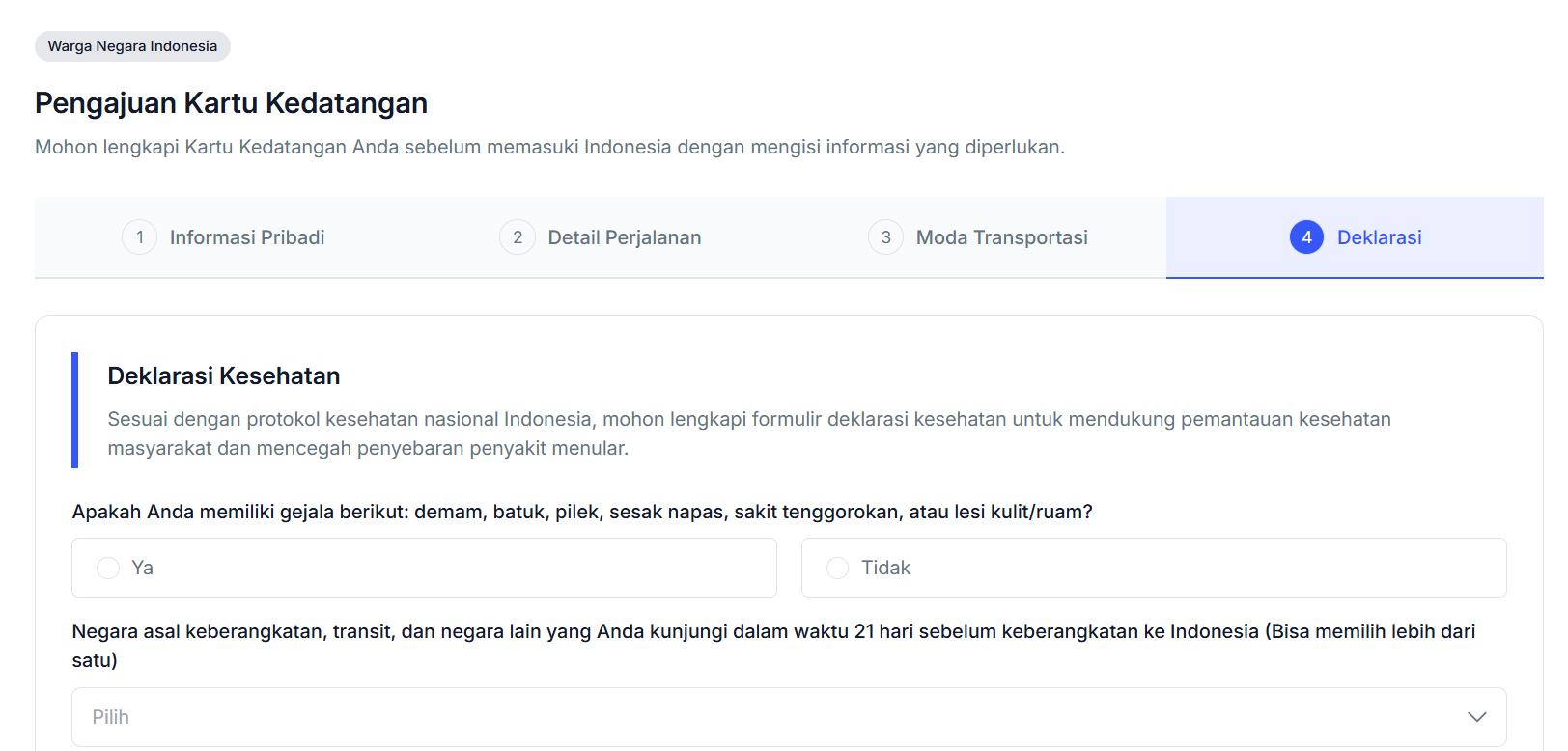 - Setelah seluruh informasi Moda Transportasi diisi dengan benar, klik Lanjut untuk melanjutkan ke tahap Deklarasi. Pada tahap Deklarasi, Anda diminta mengisikan detail seperti deklarasi kesehatan. Pada bagian ini, Anda diminta menjelaskan kondisi kesehatan serta informasi yang berkaitan dengan negara yang dikunjungi.