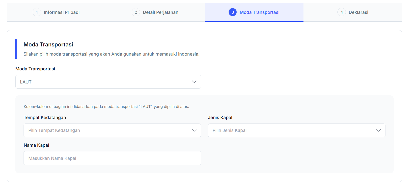 - Jika Anda menggunakan transportasi laut, Anda dapat mengisi informasi pelabuhan tempat kapal bersandar dan nama serta jenis kapal yang digunakan.