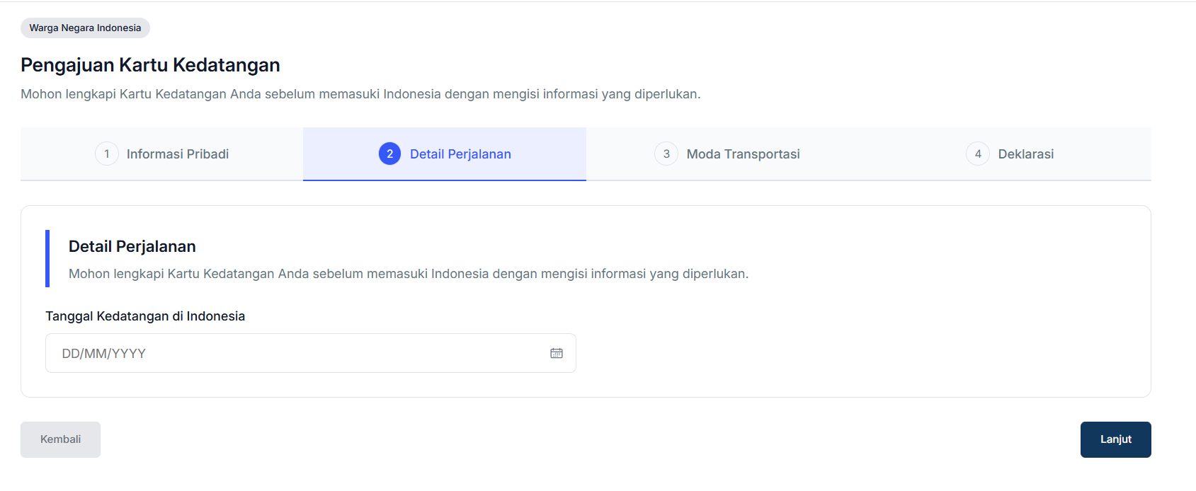 - Setelah mengisi Informasi Pribadi, lanjutkan dengan mengisi Detail Perjalanan. Lengkapi detail tanggal kedatangan Anda di Indonesia.
