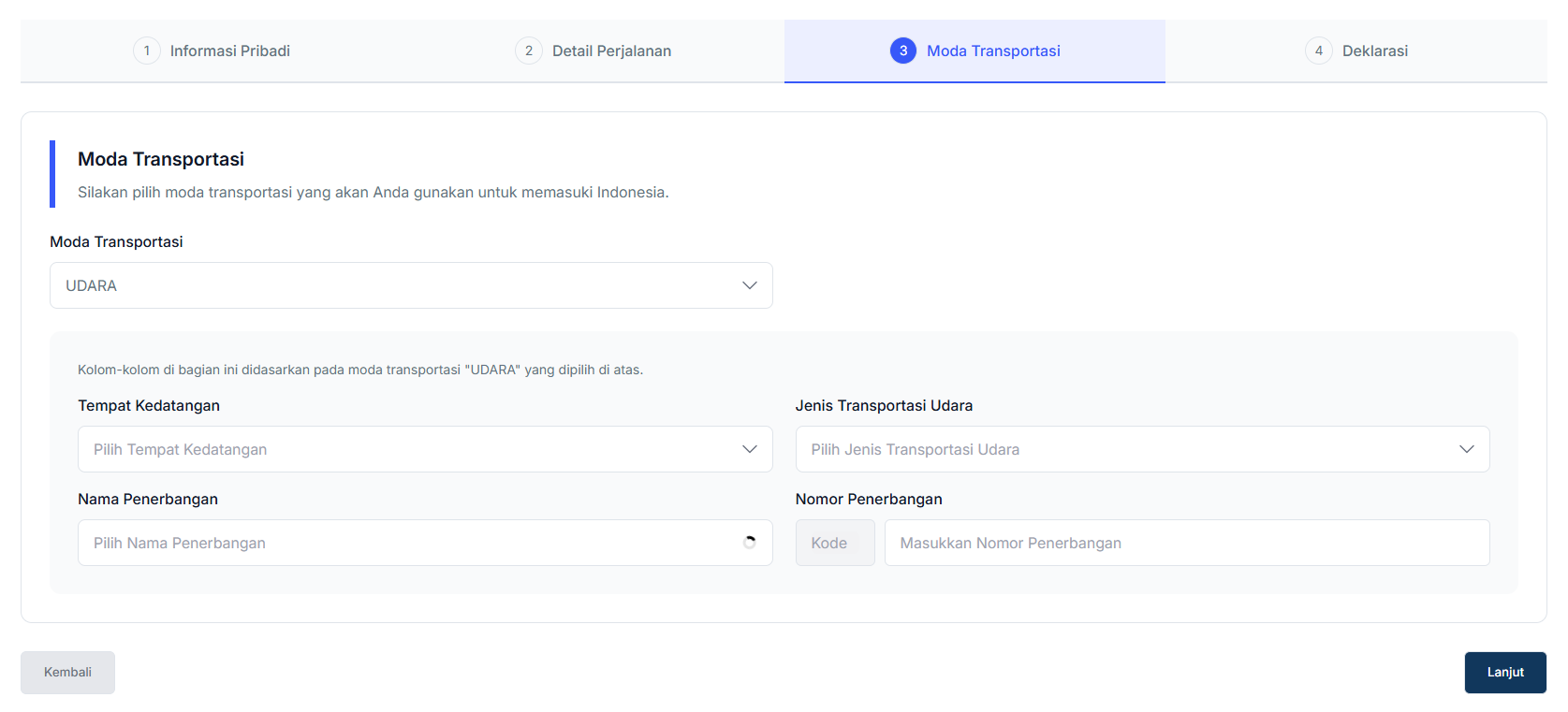 - Berikutnya, klik Lanjut, kemudian isi informasi Moda Transportasi yang Anda gunakan. Pada bagian ini Anda dapat memilih jenis moda transportasi yang digunakan serta informasi terkait perjalanan Anda. Dalam kasus ini jika Anda menggunakan transportasi udara, Anda perlu mengisi serta informasi nomor penerbangan Anda.