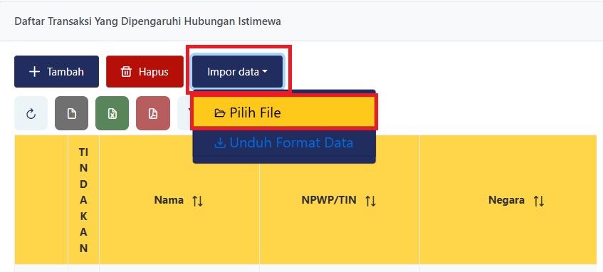 6. Setelah itu wajib pajak sudah bisa melakukan impor data pada aplikasi Coretax, dengan cara klik tombol Impor Data pada table sesuai dengan jenis konversi dan klik Pilih File.