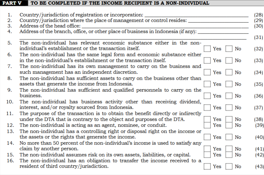 Hal ini dikarenakan Form DGT berdasarkan PMK 112/2025 disusun lebih ringkas melalui penggabungan pertanyaan terkait uji substansi dan beneficial owner, yaitu pertanyaan nomor 12 sampai dengan nomor 16, yang kini digabungkan dalam Part V (sebelumnya berada pada Part VI).