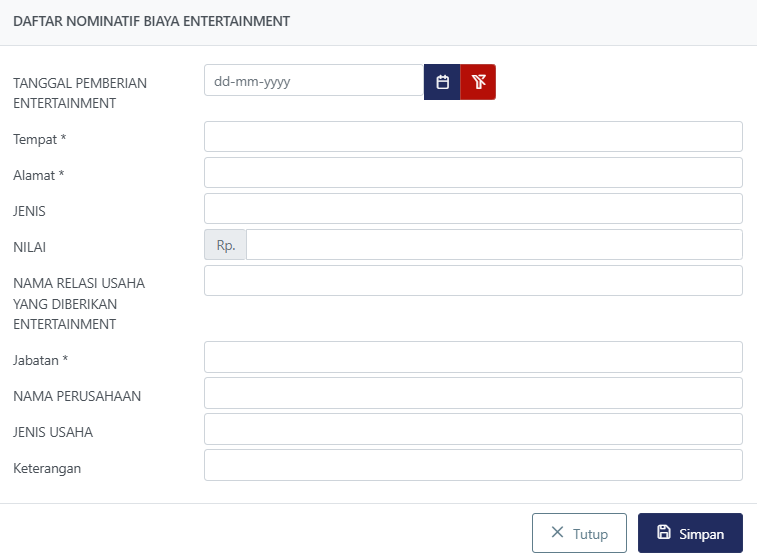 - Kolom Tanggal Pemberian Entertainment diisi dengan tanggal.