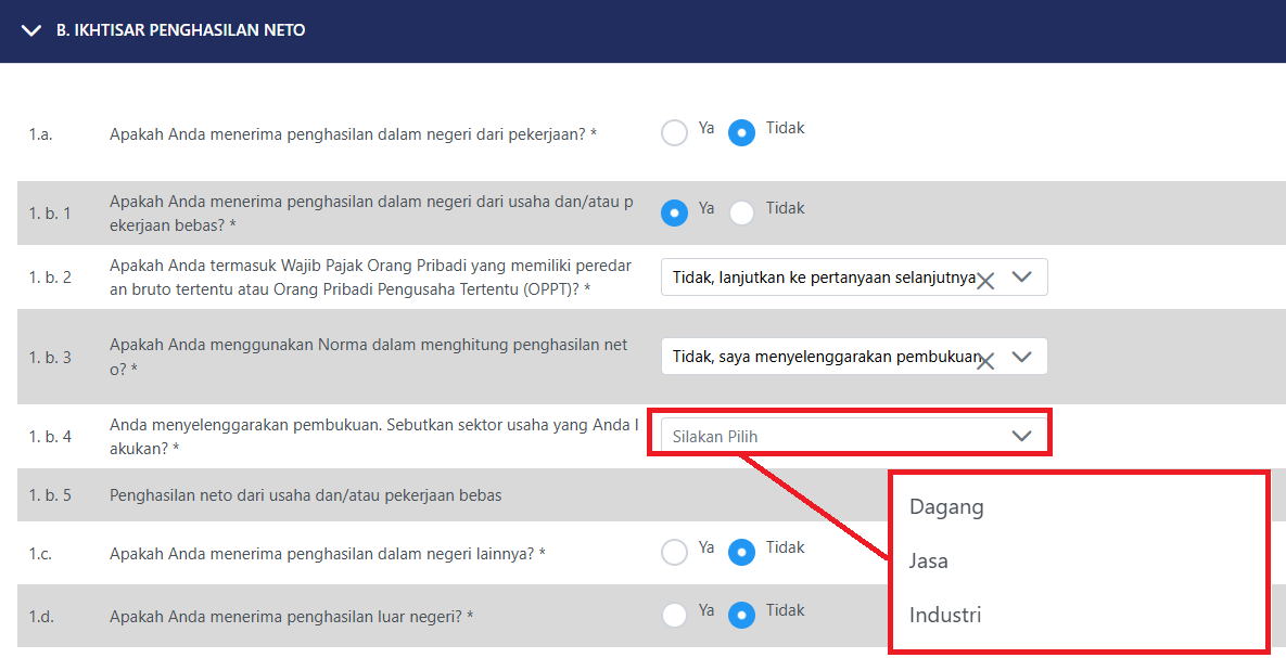 Untuk membuka lampiran L-3A, wajib pajak harus mengisi pertanyaan induk bagian B. Ikhtisar Penghasilan Neto, yakni: