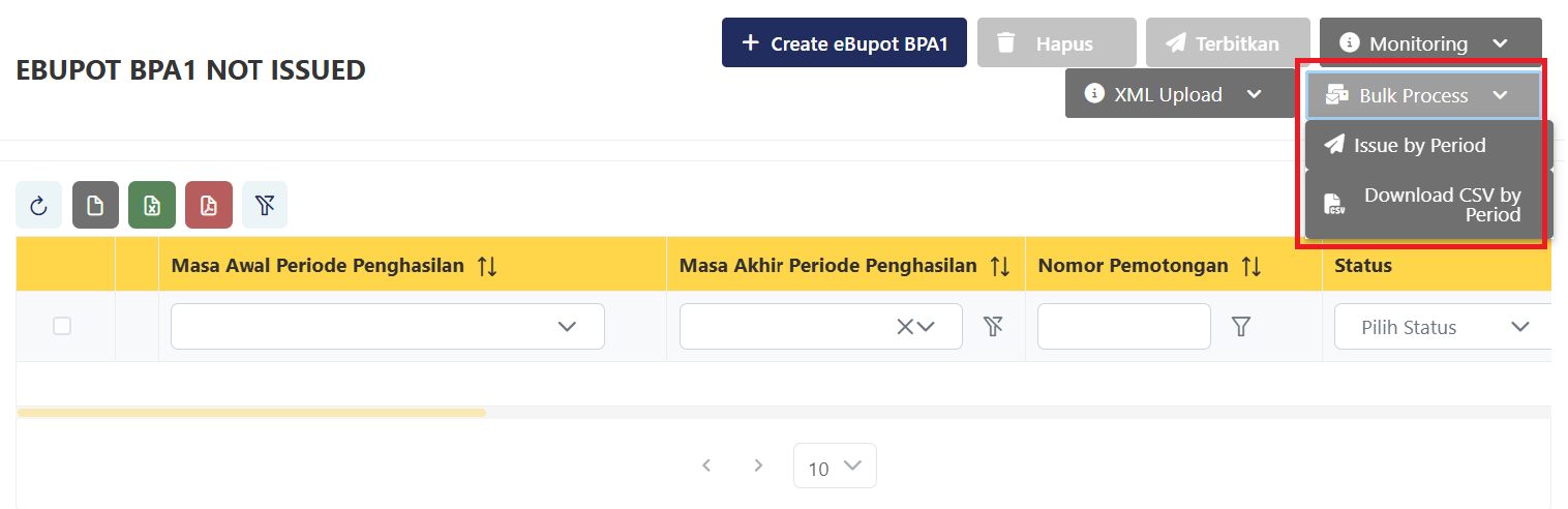 Direktorat Jenderal Pajak (DJP) melalui salah satu unggahannya di akun X @kring_pajak, selain e-Bupot, menu ini juga dapat digunakan pada menu e-Faktur. "Bulk Process" tersebut dapat digunakan wajib pajak untuk download file csv atau pdf atas faktur pajak masukan untuk setiap masa pajak yang dipilih ya, Kak," jelas DJP. Namun, saat ini fitur pada e-Faktur tersebut masih dalam proses pengembangan.