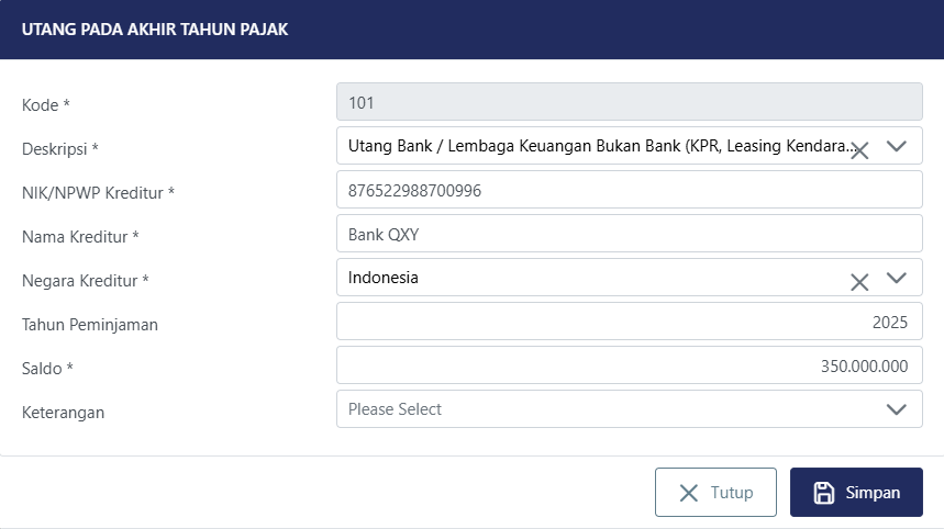Kemudian, pada L1 Bagian B pilih Utang Bank/Lembaga Keuangan Bukan Bank (KPR, Leasing Kendaraan Bermotor, dan Sejenisnya). Dalam melakukan pelaporan utang atas KPR, wajib pajak dapat mengisi kolom saldo dengan sisa utang pada akhir tahun pajak bersangkutan yang masih harus dilunasi. Wajib pajak dapat mengisi kolom saldo dengan sisa saldo KPR yang masih harus dilunasi per 31 Desember 2025.