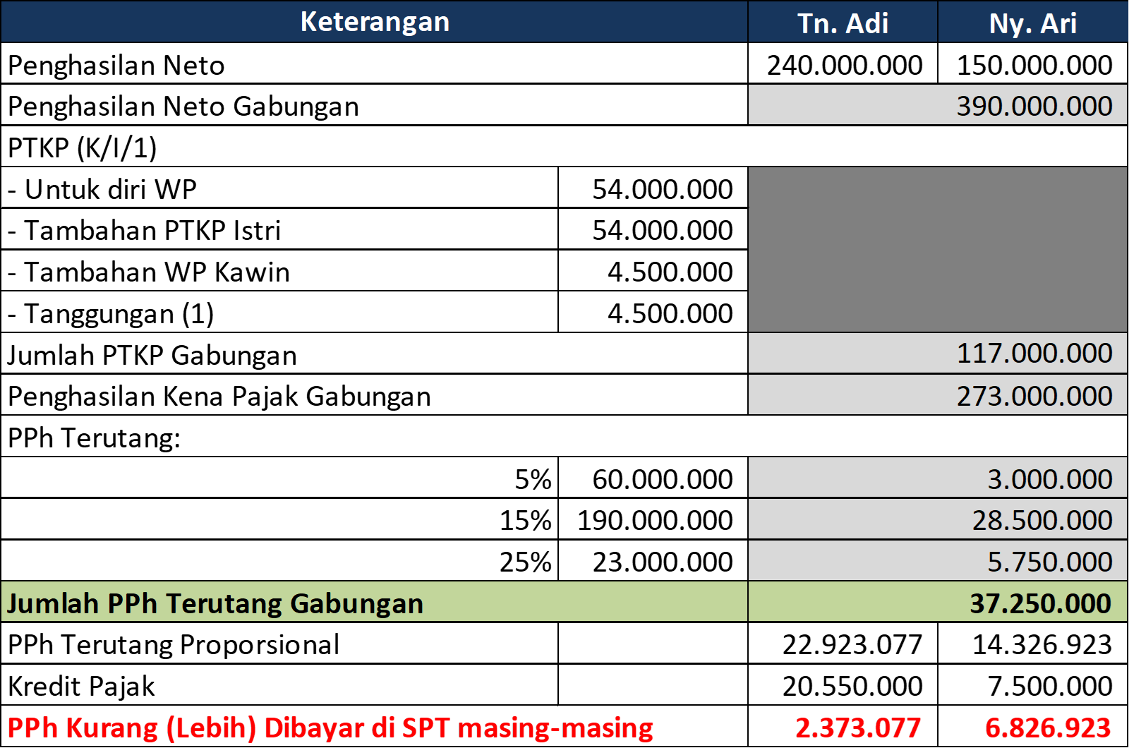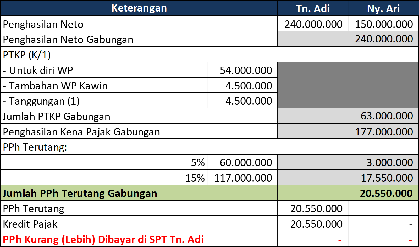 Berdasarkan penghitungan di atas, SPT Tahunan Tuan Adi maupun Nyonya Ari berstatus kurang bayar. Jika dibandingkan dengan penghitungan dengan kondisi NPWP gabung, terdapat selisih PPh terutang sebesar Rp16.700.000. Hal ini dikarenakan penghasilan neto yang menjadi dasar penghitungan bertambah, kemudian berdampak pada penghasilan kena pajak yang meningkat dan masuk ke lapisan tarif PPh OP yang lebih tinggi.