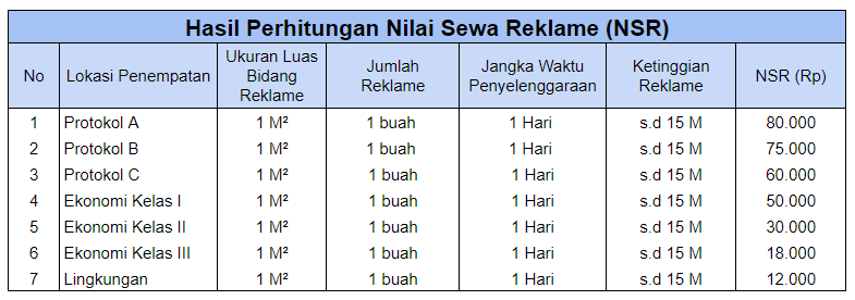 - Reklame gapura Rp2.500.000,00 untuk paling lama 1 bulan penayangan.