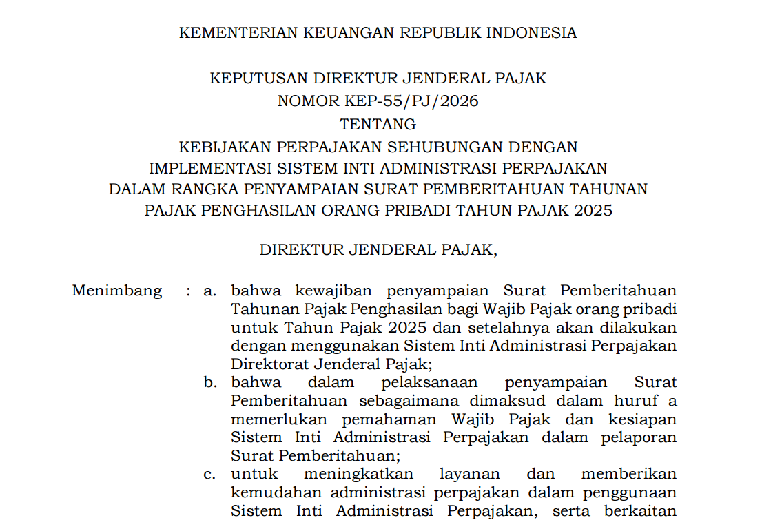 Kebijakan relaksasi ini secara resmi diatur melalui Keputusan Direktur Jenderal Pajak Nomor KEP-55/PJ/2026 yang ditetapkan oleh Dirjen Pajak Bimo Wijayanto pada tanggal 27 Maret 2026. Berdasarkan beleid tersebut, DJP menghapus sanksi administratif untuk keterlambatan pelaporan SPT Tahunan PPh Orang Pribadi serta keterlambatan pembayaran PPh Pasal 29 yang dilakukan hingga satu bulan setelah batas waktu normal. Dengan demikian, denda keterlambatan senilai Rp100.000 yang biasanya dikenakan untuk pelaporan melewati 31 Maret tidak akan diberlakukan.