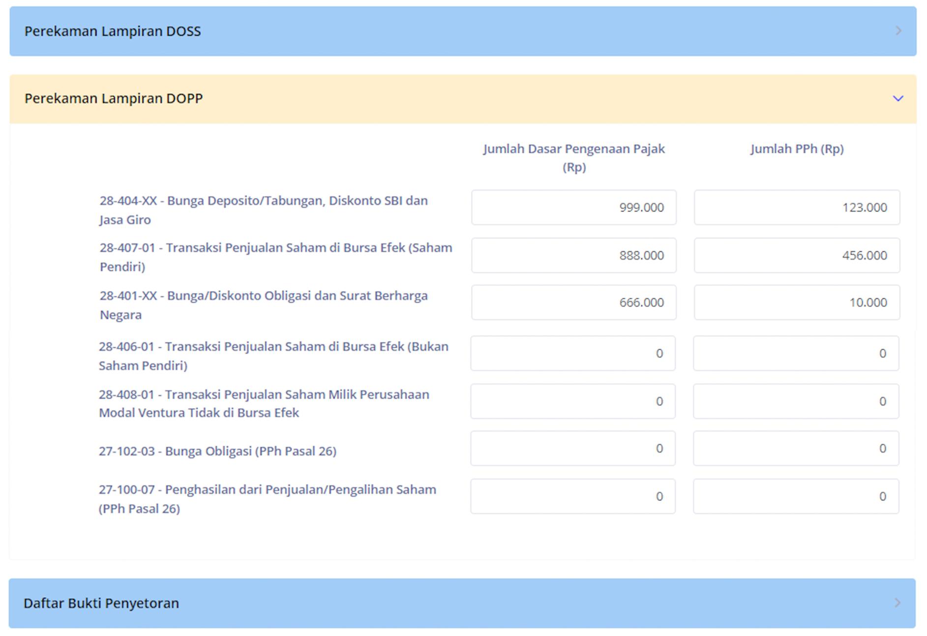 Apabila terdapat pemotongan/pemungutan terkait dengan transaksi sebagaimana yang tercantum dalam Lampiran Daftar Objek Pemotongan Pemungutan (DOPP), maka isikan secara total Jumlah Dasar Pengenaan Pajak dan Jumlah PPh yang dipotong pada kolom yang sesuai.