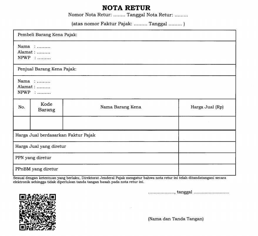 Selain itu, nota retur yang dibuat harus ditandatangani dengan menggunakan Tanda Tangan Elektronik, dan memperoleh persetujuan DJP. Perlu dicatat, nota retur perlu dibuat oleh pembeli, baik yang berstatus PKP maupun bukan PKP.
