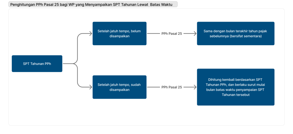 Wajib pajak dapat mengajukan permohonan perpanjangan waktu penyampaian SPT Tahunan PPh. Apabila hal tersebut dilakukan oleh WP, maka penghitungan PPh Pasal 25 dilakukan sebagai berikut: