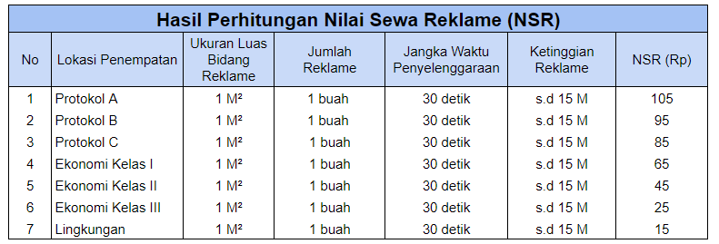 Selain itu diatur juga mengenai hasil perhitungan NSR untuk jenis reklame lainnya yaitu: